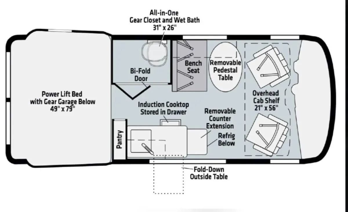🚿 Wet bath w/ cassette toilet + indoor/outdoor shower for trail rinse-offs